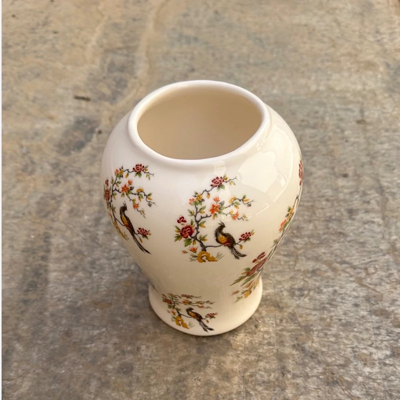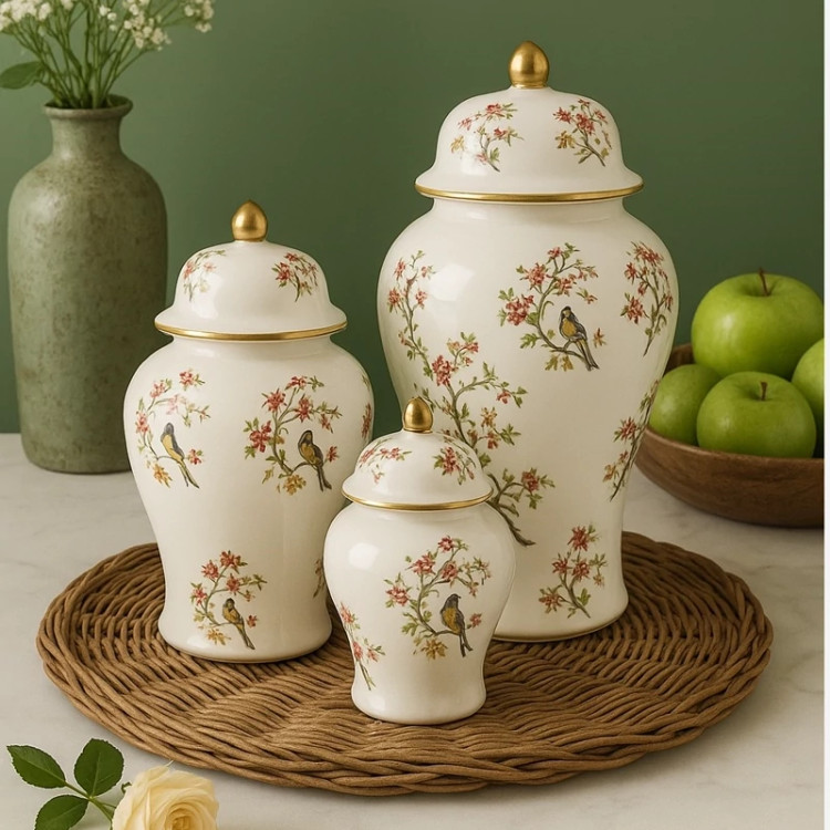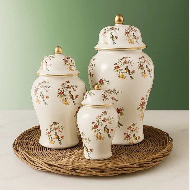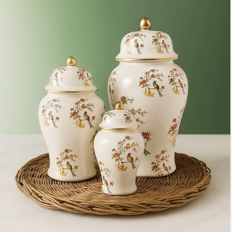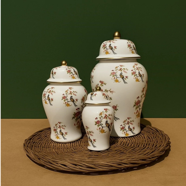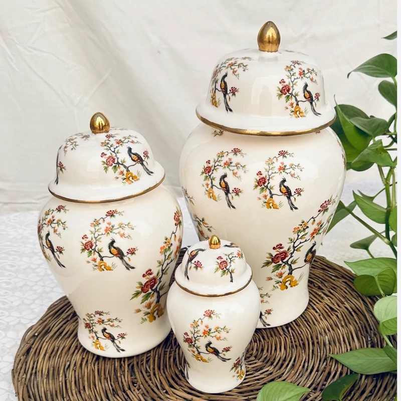 جینجرجار سرامیکی بانکه گلدان استوانه درب دار تزیینی دکوری کنسول میز توی وی پذیرایی پرنده گل سیمرغ طلایی ظرف کادویی