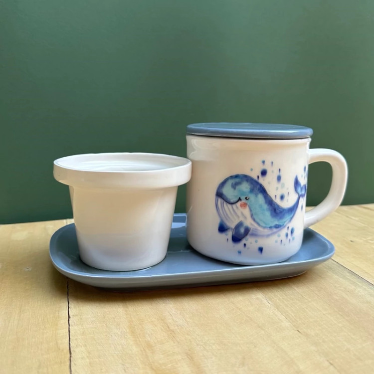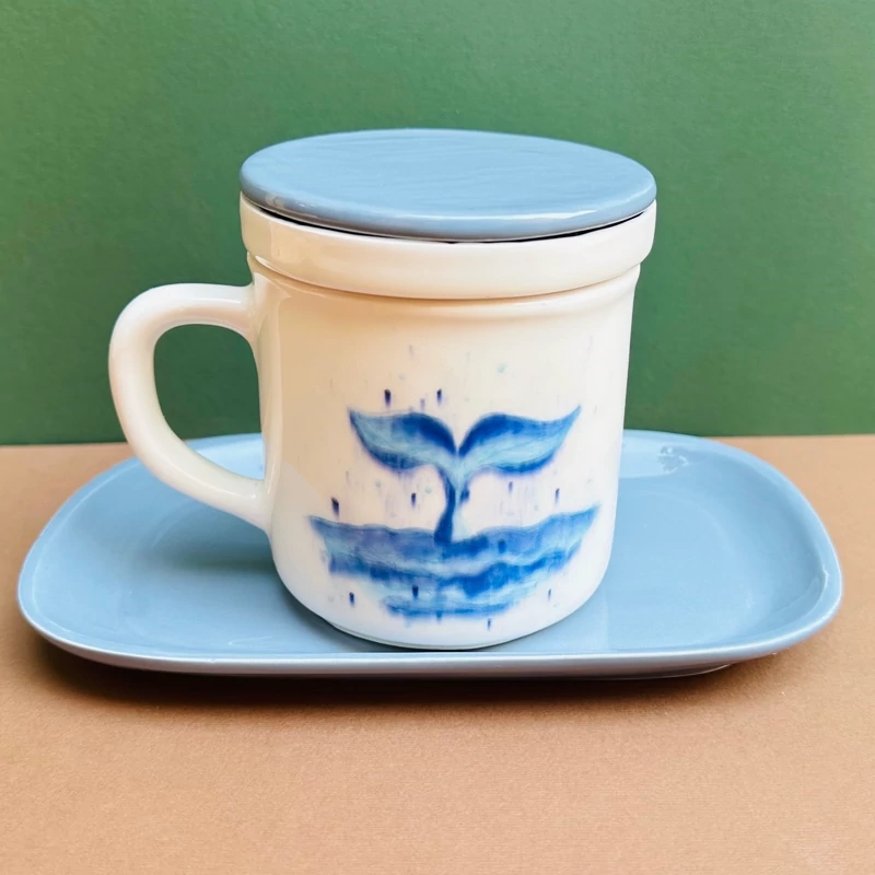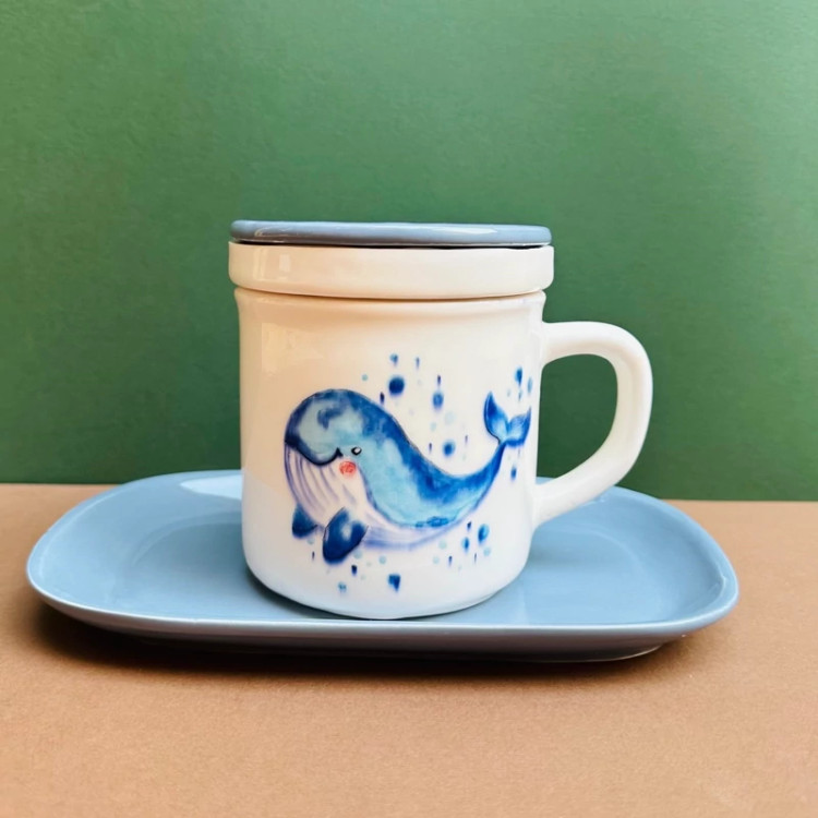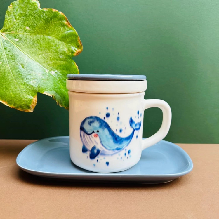 ماگ لیوان استکان ظرف دمنوش درب دار سرامیک دلفین نهنگ وال بشقاب زیرلیوانی دسته آبی طوسی فنجان چایخوری ابجوش آب تراول ماگ
