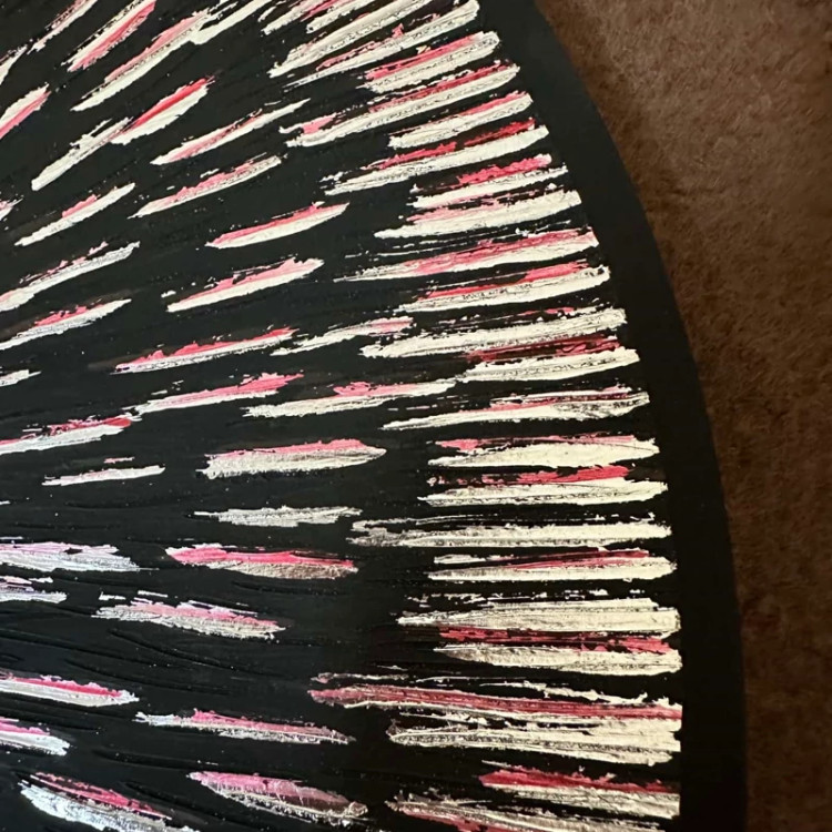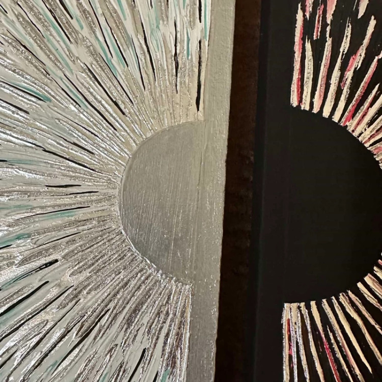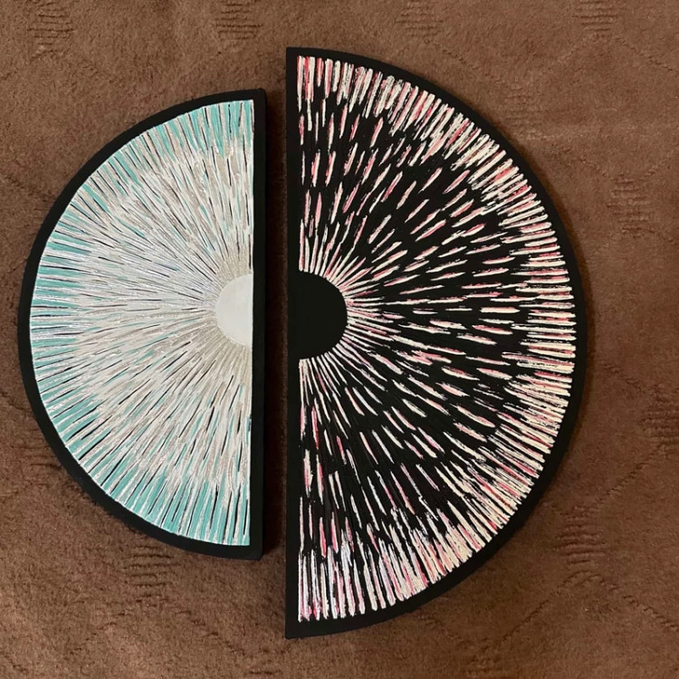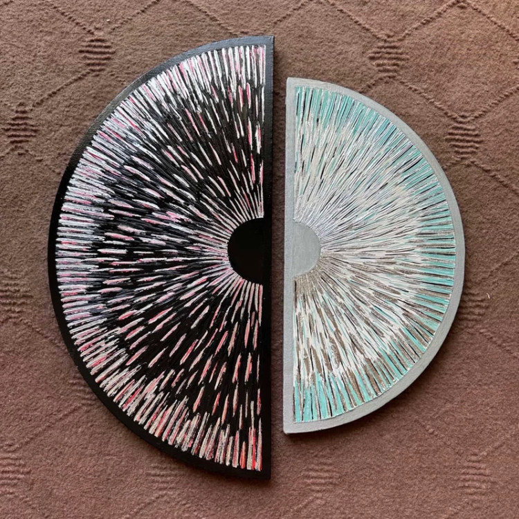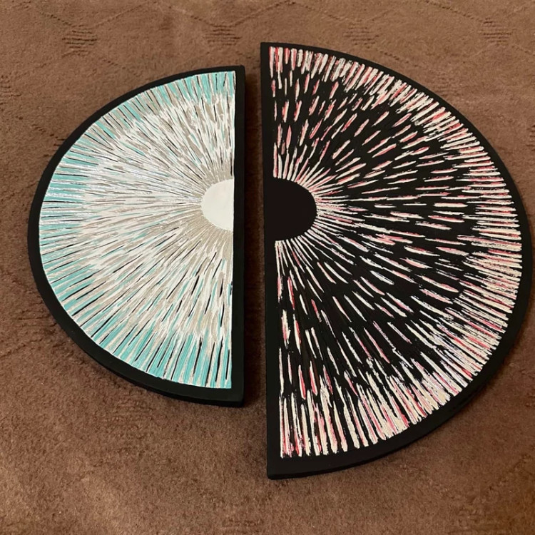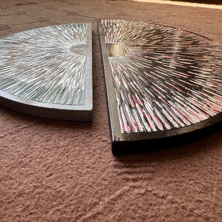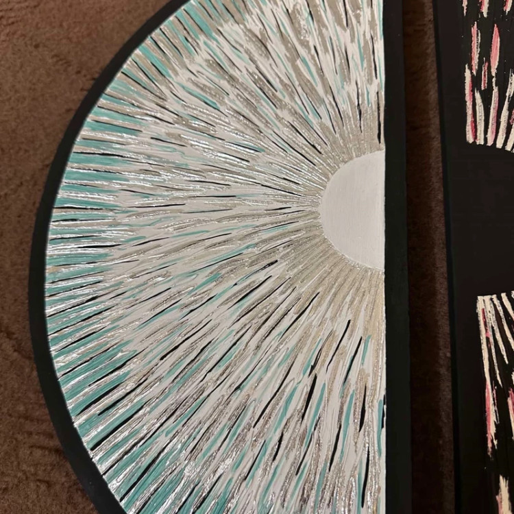 بصورت دو عدد نیم دایره هست ،سایز یکی قطر 40و دیگری قطر 50هست ،از خمیر برجسته و رنگ اکرلیک ساخته شده و قسمت های نقره ای هم از ورق نقره درست شده است!